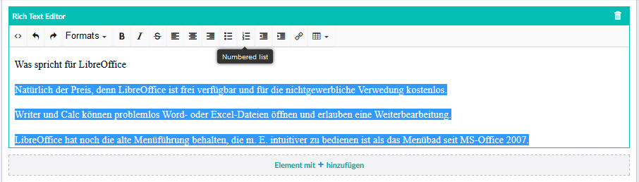 Sie müssen im Rich Text Editor die kleine Zwischenüberschrift und die drei Sätze mit je einer Absatzmarke voneinander trennen und danach markieren Sie die Absätze, die für die numerierte Aufzählung in Frage kommen. Im nächsten Schritt wählen Sie das Symbol für numerierte Liste.